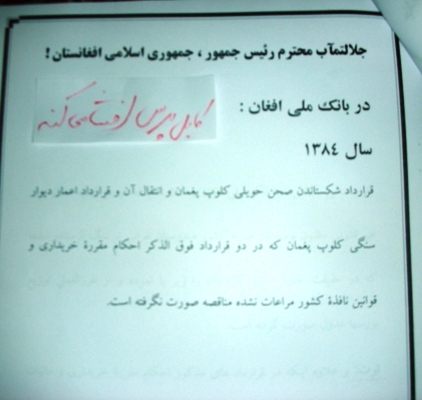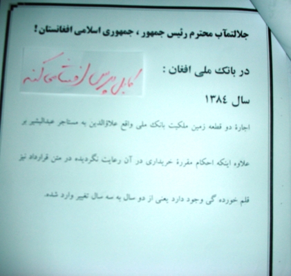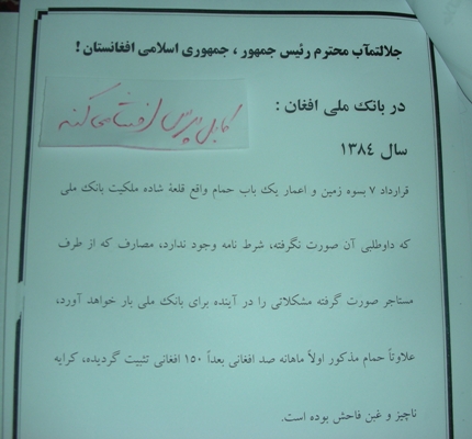 سه: هفت بسوه زمين و قرارداد اعمار يک حمام واقع در قلعه ی شاده ی شهر کابل، ملکيت بانک ملی افغان ، بدون انجام مراحل قانونی واگذار شده که بصورت فاحش سوء استفاده صورت گرفته است.