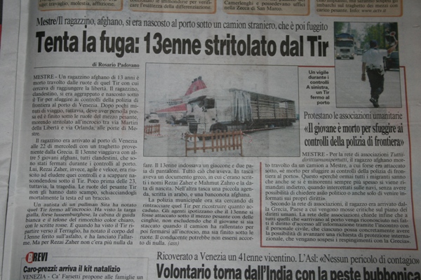 محمدظاهریک کودک 13 ساله افغانستانی که میخواست بطور قاچاق داخل ایتالیا شود توسط لاستیک های کامیون جان باخت. این اتفاق درخیابان اورلند شهرونیز چهارشنبه شب هفته گذشته حدود ساعت 10 شب بوقوع پیوسته است. تعداد انبوه ازمهاجرین افغانستانی که میخواهند وارد ایتالیا شوند مدت های زیادی به خاطر نداشتن پول درشهرپاترای کشور یونان مجبورند توقف نمایند تادرصورت امکان درکامیون های که عازم ایتالیا هستند خودرا جاسازی نموده وازاین طریق خودرا به ایتالیا برسانند. این مسافرت خطرناک که ممکن است 48 ساعت ادامه پیداکند برای این پناهجویان یک شانس حساب میشود زیرا آنها راه دیگری غیرازاین را ندارندبه گفته این پناهجویان اگرتوسط قاچاقبران بطور تضمینی بیایند مجبورند مبلغ 3000 یورو ازیونان تاایتالیا به آنها بپردازند.