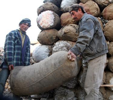 قربان علی و برادرش بوجی های ذغال را برای فروش ذخيره می کنند