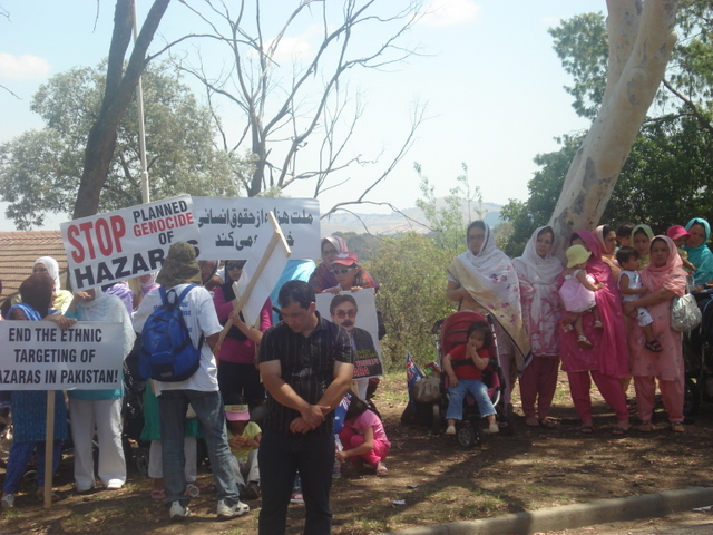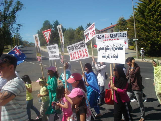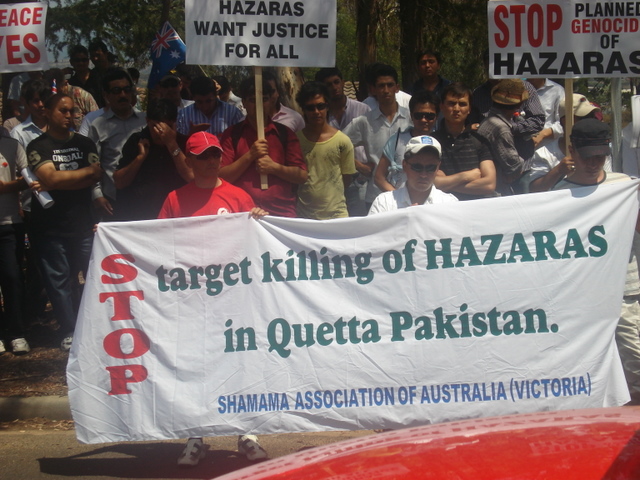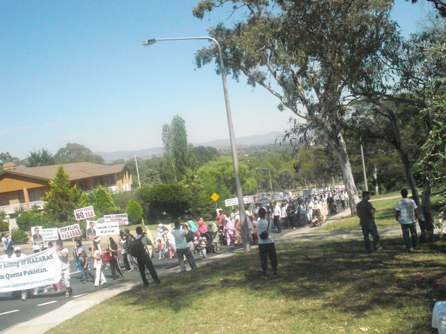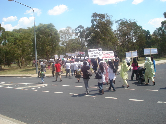 روز سوم فبروری، ده ها تن در اعتراض به ترور و حمله به هزاره های مقيم پاکستان بويژه شهر کويته، در شهر کانبرای استراليا دست به تظاهرات زدند. تظاهرات کنددگان که از بخش های مختلف استراليا مانند کوينزلند، ويکتوريا، جنوب استراليا و نيو سوت والز به شهر کانبرا آمده بودند، در پارکی بنام تياگارا در دوصد متری کمشنری عالی پاکستان جمع شده و تظاهرات خود را آغاز کردند. آن ها پلاکارهایی را حمل می کردند که بر روی آن ها نوشته شده بود، کشتن هزاره ها را در کويته متوقف کنيد، ملت هزاره از حقوق انسانی خود دفاع می کند و هزاره عدالت را برای همه می خواهد.