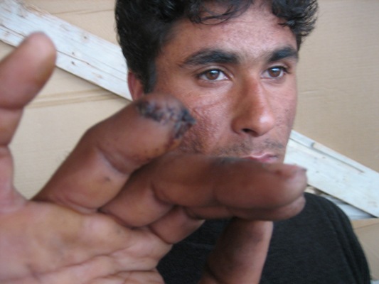 نفر سوم که برای مصاحبه به داخل خیمه آمد سمیر از ولایت مزارشریف است او یک انگشت دستش را درهمین روزها ازدست داده است وتمام بدنش کبود است. ازسمیر پرسیدم که تورا به این وضعیت رسانده است اوباچشمان پرازاشک وگلوی پرازعقده چندین بار تلاش کرد حرف بزند ولی نتوانست. واقعن همه دوستانم وقتی متوجه سمیرشدند ناخودآگاه اشکهایشان جاری شد. سمیررا دربغل گرفتم وگفتم این تنها وضعیت تو نیست هرکسی میتواند با دیدن توبه وضعیت افغانستان پی ببرد. او اشکهایش را پاک میکنند ومیگوید این وضعیت خیلی بی غیرتم ساخته است وادامه میدهد همه بچه ها روزها درپشت دیوارهای بندر صف میکشند تا کدام کامیونی درنزدیکی دیوار توقف کند وبعد هرکسی نوبتش رسیده بود شانسش را امتحان میکند وکوشش میکند با پریدن ازروی کتاره ی آهنی که تقریبا سه متر ارتفاع دارد خودرا به درون فنس fans”" پرتاب نموده ودرزیرکامیون خودرا جاسازی نماید این فقط راهی است که بچه درپیش دارد. ماندن دریونان و نوشیدن زهر و یا رسیدن به کشورهای دیگراروپایی، فقط رفتن درزیر کامیون که آنهم خطر مردن صد درصد را درپی دارد. یا رسیدن یا مرگ. هرکسی برای پریدن داخل فنس ورسیدن درزیرکامیون فقط دو یا سه دقیقه وقت دارد درغیرآنصورت کوماندوهای وحشی یونان سرمیرسند آنوقت باید زیر لگد و باتوم های آنها تکه تکه شوی. من وقتی میخواستم ازروی نرده به داخل بپرم کوماندو سررسید وازترس اینکه شکمم را سرنیزه های نرده سوراخ وبدنم مثل گوشت کبابی روی آن نماند بااحتیاط میخواستم دوباره خودرا به بیرون پرتاب کنم ولی کوماندوها سررسیدند، یکی ازآنها که باتوم به دست داشت بافشار تمام باتوم را روی دستتم کوبید اول نفهمیدم. وقتی به بیرون رسیدم متوجه که یکی ازانگشتان دست چپم ازنیمه قطع شده است. با دیدن آن ازهوش رفتم وقتی به هوش آمدم دوستانم مرا بدون کدام آمبولانس به نوبت روی کولهای های به شفاخانه رسانده بود، بلافاصله قصابی که اسمش را داکتر گذاشته بودند سررسید اوبدون کدام داروی بی حس کننده استخوانهای شکسته انگشتم را که روی دستم آویزان شده بود با انبور کشید ومن ازهوش رفتم. دوباره وقتی به هوش آمدم شب بود ودوستانم مرا به خیمه انتقال داده بود. حال چندین روز است که درد میکشم وهیچ پولی ندارم که حتا یک داروی بی حسی بخرم تاشبها کمی بتوانم بخوابم. خیلی درد آوربود. شما فکرکنید نقض حقوق بشرتاچه اندازه صورت گرفته است. سمیرباچشمان پرازاشک ورنگ وروی پریده ادامه میدهد ازدوستانت که حقوقی هستند سوال کن که آیا قوانین حقوق بشر برای افغانی هم هست یانه؟