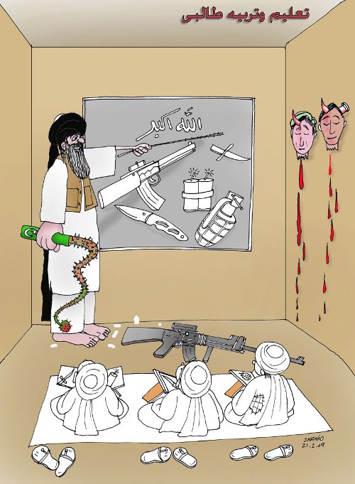 با عرض معذرت. بنظرم این اثر کارتون نیست. بیشتر یک نقاشی کودکانه است تا کارتون. این درست همانی را که میبینیم را میرساند.(طالبان خشونت می آموزند) پس این شد نقاشی. عکس هم زیاد ازین قاعده مستثنی نیست. اما کارتون اثریست که معنی اش در بُعد دگری نهفته. یعنی چیزی را که میبینی همانا معنی اش نیست. باید بیننده خود بدنبال معنی بگردد و نکته مهم و مختص کارتون هم همین است. لطفا کاری نکنید که بیشتر مورد تمسخر قرار بگیریم. البته من زیاد درین سایت نمیگردم. چون اینرا یک دوست ایرانی با تمسخر برایم گفت، نارحت شدم و مجبور شدم بیایم و ببینم. سعی کنید واقعا کارتون بکشید نه نقاشی. این برای خوبی خودتان است نه من. ما بحد کافی کمبود فرهنگی داریم. شما دیگر تاکیدش نکنید. سعی در اصلاحش باشید. اینرا دوستانه میگویم. من خوبی شما و کشورم را میخواهم جناب کارتونیست عزیز. امیدوارم که آزرده نشده باشید.