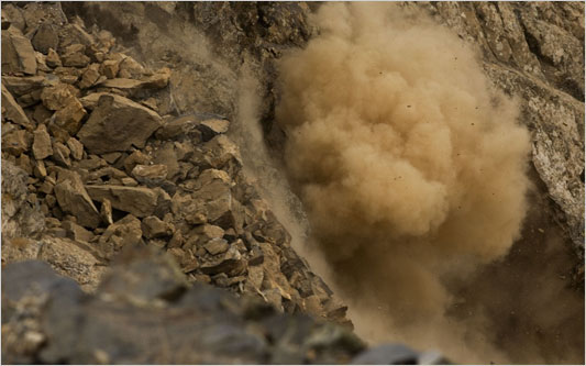 آقای جاوید 22 ساله، در حالیکه مصروف کار با چراغ گازی بود، چکش خود را پائین گذاشت و شروع به ایجاد سوراخ در گرانیت با مته (جبل) کرد. رحیم الله 27 ساله، یکی از کارگران آقای جاوید، یک پلاستیک مملو از پودر مواد انفلاقیه را همرای یک چوب برای داخل بردن آن در سوراخ های ایجاد شده آورد.