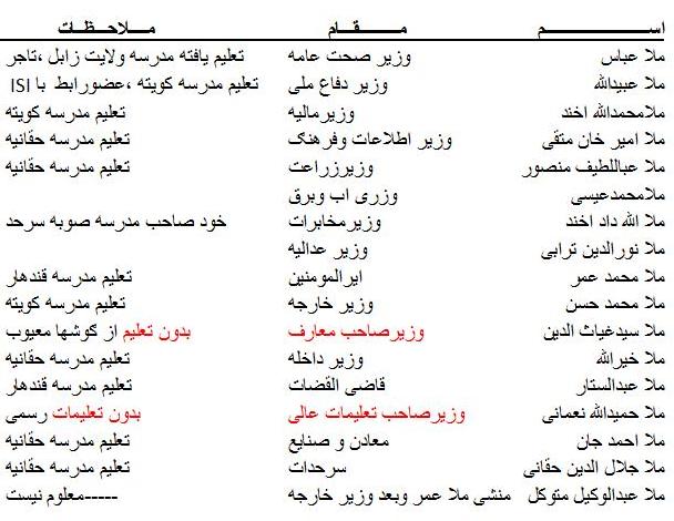 بدین ترتیب ما میبنیم کابینه کاری یک ملک جنګ زده در قرن ۲۱ درعصر تکنالوجی و انترنت که جهان را بیک دهکده کوچک تبدیل کرده جالب ان است که وزیر تعلیمات عالی ووزیر معارف هردو بیسواد که صرف خواندن ونوشتن یاد داشتنداین بدان معنی است که طالبان هیچ نوع علاقه مندی به ترقی وتعالی کشور نداشتن کتب وسیستم اموزشی که در زمان این وزیرصاحبان در وطن پیاده شد با فراغت ا زفاکولته سطح سواد یک جوان ا ز سطح تحصیل وزیر صاحب تحصیلات عالی ومسلکی ووزیر صاحب معارف بلند نمیرفت ایا این کابینه به افغانستان چه خدمت میتوانست انجام دهد؟ ایا این کابینه توانائی صحبت وجلب حمایت کشورهای صنعتی را داشت ؟ ایا این کابینه میتوانست باشرکتهای بزرګ که درراًس انها سازمان های مجرب (جاسوسی دربخش اقتصادی)قراردارند ویاتحت نظر ومشوره این سازمانها کار میکنند واقتصاددانان میباشند معامله به نفع کشور انجام دهند ومطمین باشند که فریب نخورده اند؟ایا توان حداقل صحبت درساحه علمی، اقتصادی ،تخنیکی سیاسی رادارند؟ پلان های پاکستان بخاطر انقراض علم وفرهنګ وملت افغانستان توسط این کاببنه عملی میشد وزارت خانه بنام وجود داشت ازسیستم دفتری ودیوان خبر نبود سیستم ترانسپورت زمینی ونقل وانتقال سیستم پاکستانی شد تشکیلات اردو محدود شد به ګروپ ملیشه تیپ پاکستان اسعارافغانی از توجه افتید و بجای ان کلدار مروج شد مکاتب دختران مسدودشد واز طرف دیګر فرمان صادر کردند که قرارذیل است۰