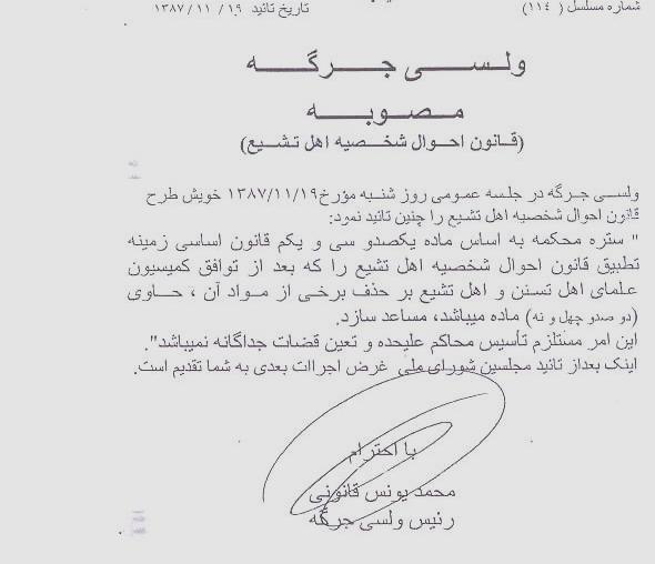 احوال شخصیه (ازدواج- طلاق-ارث-وصیت- فرزند خواندگی)مربوط است به مذهب شخص.تصویب قانون یک مذهب از سوی اکثریت معتقد به مذهب دیگر توجیه موجه ندارد.معنی تصویب ان است که مرجع تصویب کننده مختار و مبسوط الید است حال انکه قواعد و احکام مذهبی از دایره تصویب ان هم از ناحیه غیر اهل ان مذهب خارج است.بلی در مورد ناهماهنگی باقانون مربوط به نظم عمومی که ازقوانین امری است حکم قانون مقدم خواهد بود.بنا براین همان اصل قانون اساسی کفایت دارد و نیازی به قانون احوال شخصیه اهل تشیع(که بی معنی است) نخواهد بود و محاکم در مورد اهل تشیع طبق قواعد مسلم ومتداول مذهب انان( که قانون مصوب معتقدان غیر ان مذهب نمی تواند در ان جرح وتعدیل کند) حکم می کنند .اگر قرار بود در احوال شخصی هم طبق قوانین پارلمان عمل شود نیازی به ان اصل در قانون اساسی نبود و ان اصل قانون اساسی به معنی ان است که پارلمان حق مداخله ندارد.بنا براین قانون مصوب برخلاف قانون اساسی است.