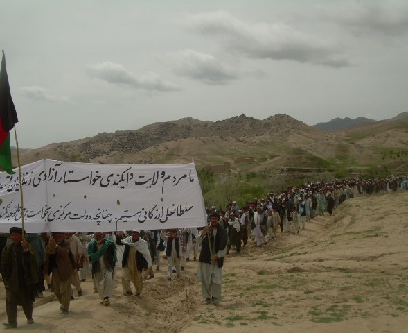 تشکر از شبکه خبر رسانی کابل پرس? که اخبار جدید ودست اول راارائه میدهند. میخواهم به خبر جدید تان بیافزایم اینکه امروز تاریخ 8 ثور نیز درحدود 500 نفر که تقریبا20% شانرا زنان تشکیل میدهند به تعقیب خواسته های قبلی شان دست به تظاهرات صلح آمیز زده اند. اینان که از شهر نیلی (مرکز ولایت دایکندی ) تظاهرات راآغاز نموده اند با شعار های: شیرزاد خیانت کرد، والی حمایت کرد، مرگ بر خیانت کار، خیانت کار نمیخواهیم، ما حامی دولتیم، به طرف دفتر ولایتی یوناما وکمیسیون ولایتی حقوق بشر در حرکت شده اند که همینک 12:30بعد ظهر پیش روی دفتر کمیسیون مستقل حقوق بشر هستند. تظاهرات کنندگان هنوز بررهایی زندانیان بیگناه شان و برکناری سلطان علی ارزگانی از مقام ولایت دایکندی پا فشاری مینمایند ومیگویند تا دولت مرکزی به خواسته های ایشان وقع نگذارد به تظاهرات وتحصن خویش ادامه خواهند داد.