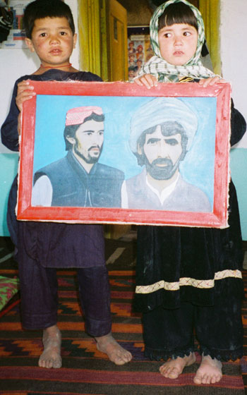 Two cousins hold a portrait of their fathers who were killed by Taliban in Yakaolang Bamiyan.