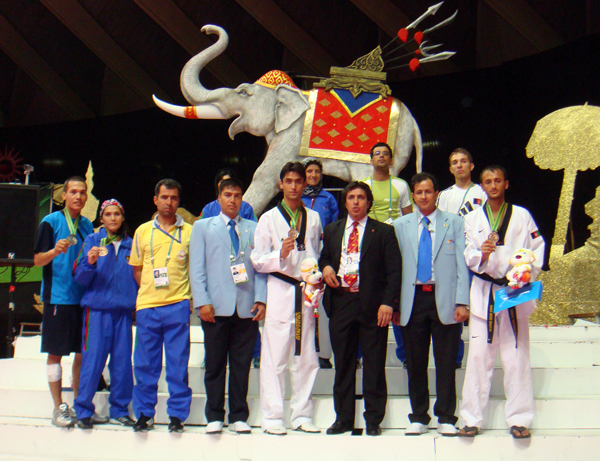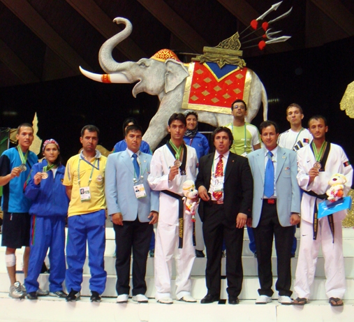 Nissar Ahmad Bahawi, 24, (in the middle) won the gold in Taekwondo in Bangkok.