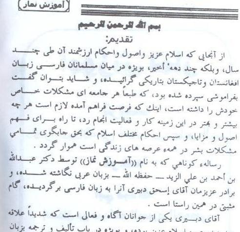 از آنجائیکه اسلام عزیز و اصول و احکام ار زشمند آن طی چند سال، و بلکه چند دهه اخیر، در میان مسلمانان فارسی زبان افغانستان و تا جکستان بتاریکی گرائیده، شاید بتوان گفت به فراموشی سپرده شده بود.....