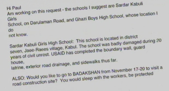 تماس دوباره با يو. اس. آی. ای. دی؛ از آن 680 مکتب در پايتخت و جایی که حدود چهار ميليون تن زندگی می کنند، حداقل باید یکی باشد. نيست و تلاش برای یافتن آن بی فایده است. اين سازمان در آخرين نامه اش می نويسد بيشتر اين مکاتب در نقاط دور افتاده ساخته شده اند.