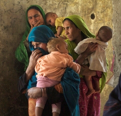 Three Afghan women hold their children in the late afternoon autumnal sun, which is a fortunate moment when one of the biggest challenges that women in Afghanistan face is maternal health and high maternal mortality.