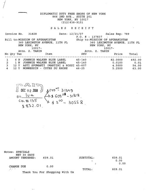 کابل پرس?: ورقه های رسید (فاکتور یا بیل) زیر نشان می دهد که در نمایندگی جمهوری اسلامی افغانستان به مديريت ظاهر طنین، در سازمان ملل مشروبات با درصد بالای الکل نوشیده می شود. با توجه به معلومات درج شده در این رسید ها، مواد الکلی به نمایندگی افغانستان در سازمان ملل متحد فرستاده شده است. در يکی از اين رسید ها نام ظاهر طنین نماینده ی دایم افغانستان در سازمان ملل متحد آمده است. مشروبات الکلی سفارش داده شده از انواع مختلف می باشد. شراب، ويسکی و ودکا. تاکید می شود که این مشروبات الکلی به نام نمایندگی افغانستان در سازمان ملل می باشد به هیچ عنوان مورد شخصی نیست.