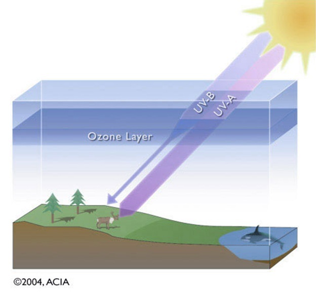 دراینجا UV-BوUV-A شعات ماورا بنفش است که به نانومتراندازه میشودوهرقدرکه این لایه نازک شود تأثیرات این شعات قویتر شده وباعث امراض گوناگون مثل سرطان پوست پیرشدن زودرس در پوست بدن وازدست رفتن بینائی وسائر امراض میگردد. همچنان تأثیرات سؤ بالای نباتات دارد.اگر این شعات بدون عبورازاین ساحه مستقیماً به زمین برسد حیات برروی زمین را ناممکن میسازد.
