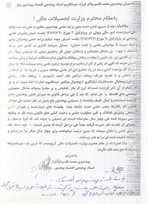 اما ریاست پوهنتون بلخ ناجوانمردانه بعد ازسه سال می نویسد که محتوی اثرشان فوق العاده وسیع ومفصل می باشد بناً تجدید نظرنمایند.اسناد سخن می گویند.