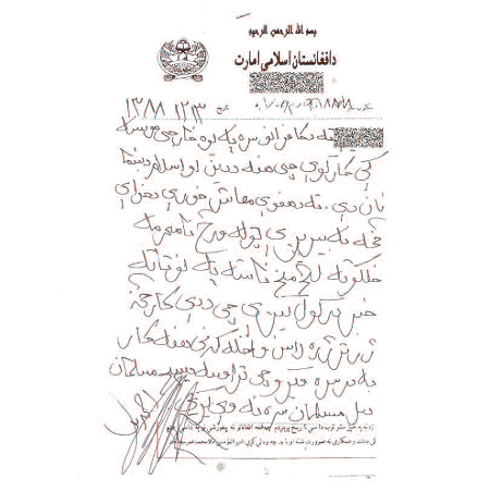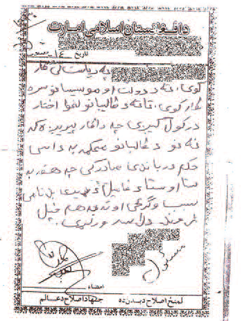 نام حذف شده است/ تو با / محل حذف شده است/ کار می کنی. به تو هشدار داده می شود که کار با آنان را رها کنی در غیر اینصورت دادگاه طالبان تصمیمی درباره تو می گیرد که سرانجام سختی برای تو و خانواده ات خواهد داشت. تو زندگی ات را از دست می دهی.