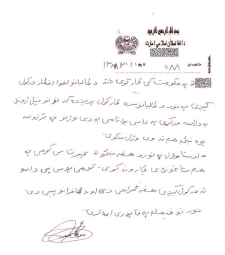 نام حذف شده است/ تو در مکتبی درس می دهی که مکتب دختران است. تو باید از خدا بترسی. ما به تو هشدار می دهیم که هر چه زودتر کارت را به عنوان آموزگار ترک کنی در غیر اینصورت سر فرزندانت را می بریم و دخترت را آتش می زنیم. تو وضعیتی را درست می کنی که پشیمان می شوی. این اولین و آخرین اخطار است.