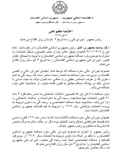اگر که کرزی به گشایش پارلمان دوم موافقت نمود از سبب فشار کشورهای خارجی از جمله اخرین اخطار ملل متحد بود !!