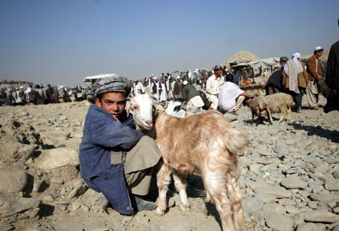 يک پسر که کوشش دارد بزهای خود را در مال بازار شهر کابل در ساحه کمپنی به فروش برساند.