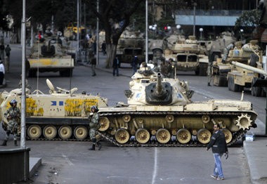 قاهره، 30 ژانویه، سدّ راه توسط تانک. از پلیس خبری نیست