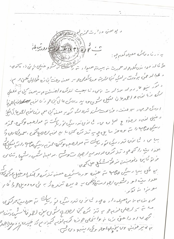 ولا که همی میرهزار ام بلا میکنه که ای اسناد وزارت معارف پیدا کده ، شفترای وزیر و رئیس هایشه میکشه . میگوفتن که : خطی دارم که کور میخانه ولی جور بزور میخانه ! مه بیچاره کمسواد (کور) که احکام نتانستوم بخانوم ای رئیسای (جور) چطو میتانن بخانن ، بلا میکنن ، بخدا که بلا میکنن !