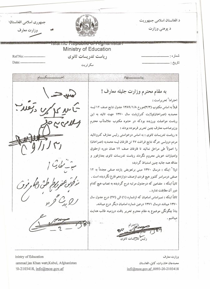 اوبیادرا ! اولأ ،همی رئیس صاحب تدریسات ثانوی ، پیشنهاد خوده چاپ کده که وزیر صاحب خانده بتانه و کته کته نوشته کده که ، ده سال 1370 شاگردای شاری و قشلاقی تا صنف یازده درس میخاندن و ای تارتق های کوس کنری صنف دوازده ره ده کوجای بوبوی شان خاندین که حالی مه تصدیق کنوم ؟