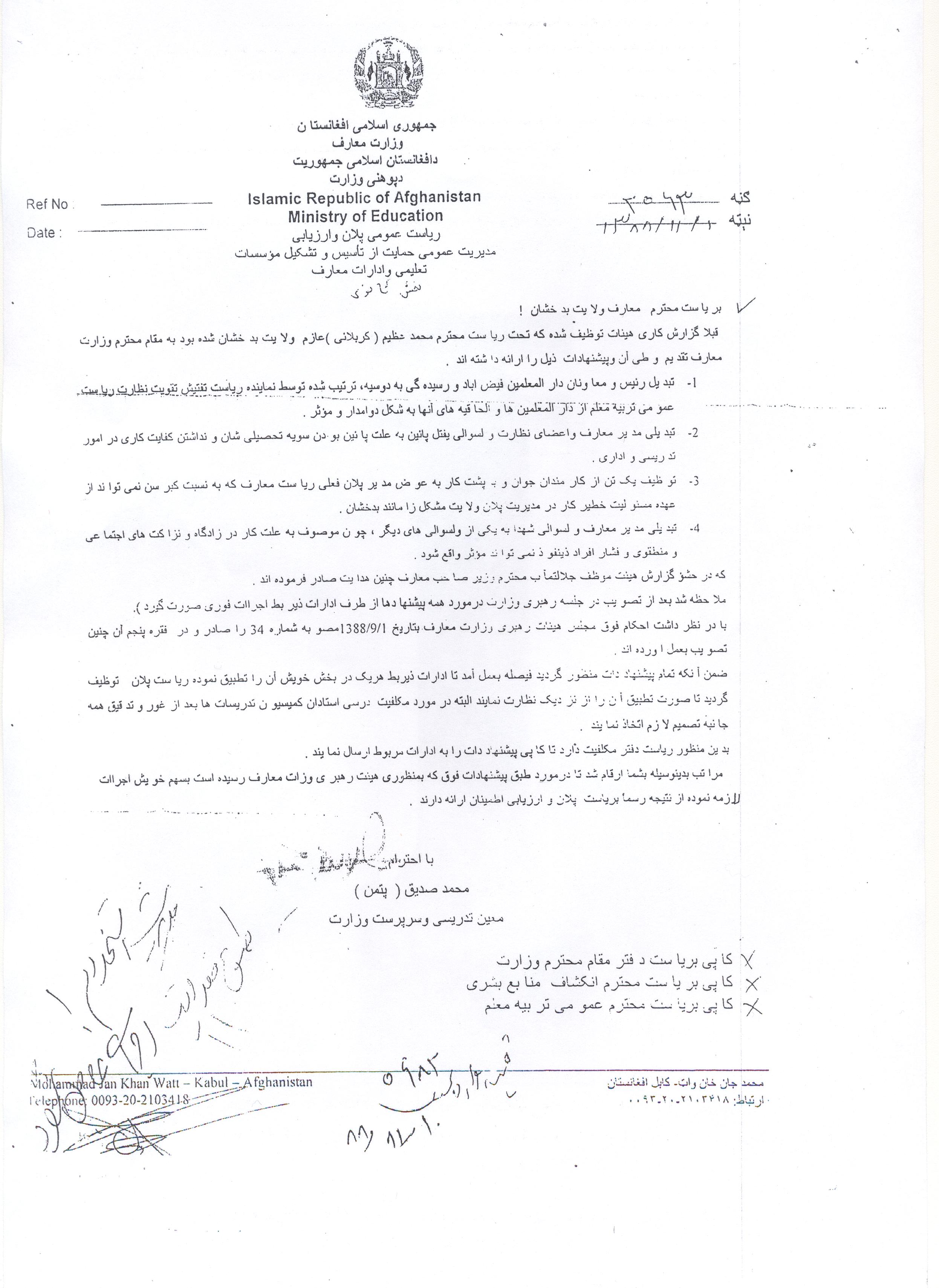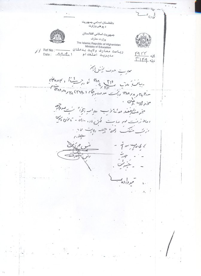 وزارت معارف ایشان را خلاف اصول، قوانین، لوایح، و مقررات معارف به تاریخ 11/07/1389 توسط ریاست معارف بدخشان مجدداً به عنوان مدیر معارف یفتل پایان، معرفی نمودند. بناً بنده ورقه ی عرض را ضمیمه ای کاپی اسناد های فوق به وزارت معارف تقدیم نمودم که وزیر معارف در حشو آن چنین حکم را صادر نمودند: ریاست منابع بشری در توظیف مدیر معارف یفتل پایان در نتیجه یک امتحان سالم در حضور داشت معین تدریسی اقدام نمایید. 22 قوس 1389 فاروق وردک وزیر معارف