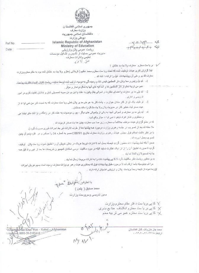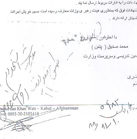 من برای اعاده ی حقوقم یک بار دیگر کاپی همه اسناد های دست داشته ام را، با یک عریضه ی دیگر خدمت وزارت معارف مراجعه نمودم که در آن زمان محترم فاروق وردک وزیر معارف در سفر بیرونی تشریف داشتند و جناب محترم محمد صدیق پتمن معیین تدریسی وزارت در عدم حضور وزیر به عنوان سرپرست، در پایان عریضه ی بنده این حکم را صادر نمودند.