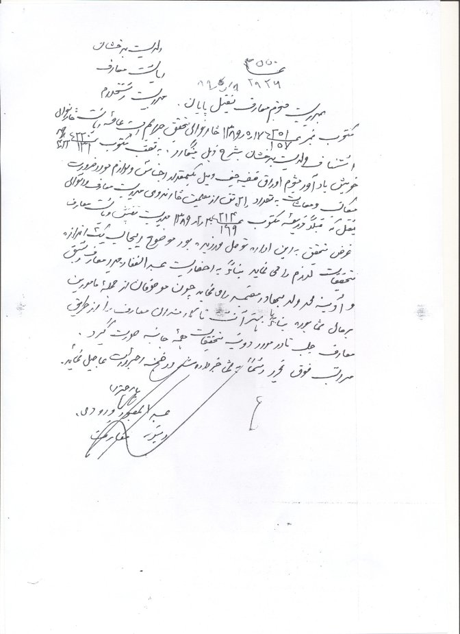 به اساس مطالعه سوابق عبدالغفار مدیر معارف یفتل پایان که به اساس بررسی هیات های تحقیق سوی استفاده نموده و در قضیه اختلاس مجرم شناخته شده و از وظیفه سبک دوش گردیده، دوباره به صفت مدیر معارف به اساس P.R.R قبلی معرفی شده نمی تواند.محترم فضل حق حکیمی که قبلاً به حیث سرپرست مدیریت معارف یفتل پایان اجرای وظیفه نموده، مجدداً معرفی گردد و پست ذکر شده به رقابت آزاد گذاشته شود، از اجراآت تان اطمینان دهید. محمد صدیق پتمن معین تدریسی و سرپرست وزارت معارف 21/10/1389