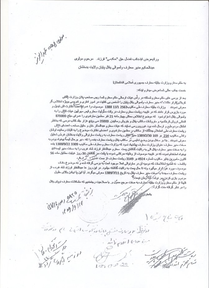 قابل توجه وزارت محترم معارف، بنده فضل حق حکیمی مدیر معارف ولسوالی یفتل پایان ولایت بدخشان هستم مدت 17 سال است که به عنوان آموزگار، مدیر لیسه و مدیر معارف ولسوالی یفتل بدخشان، اجرای وظیفه نمودم. آن گونه که به همه مردم عزیز افغانستان روشن است، پس از روی کار آمدن نظام جدید در کشور، یکی از بخش هایی که انتظار می رفت بدان توجه لازم مبذول داشته شود، معارف افغانستان بود.