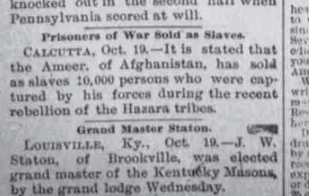 کلکته 19 اکتبر: چنین آمده که امیر افغانستان، ده هزار تن را که توسط سربازانش در جریان قیام طوایف هزاره دستگیر شده بودند، به عنوان برده فروخت.