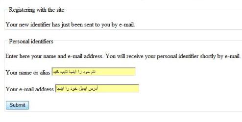 در صفحه ای که باز می شود شما بايد ابتدا نام خود و آدرس ايميل را وارد کنيد. سپس روی کلمه ی سابميت يا همان تاييد را کليک کنيد.