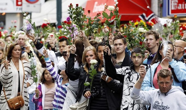 صدها هزار نروژی امروز در نقاط مختلف گرد هم آمدند و یاد ده ها تن کشته شده در روز 22 جولای را گرامی داشتند. آن ها در حالی که گل های رز در دست داشتند، آمده بودند تا بگویند دموکراسی آری، عشق آری، راسیسم نه. ینس استولتنبرگ صدر اعظم نروژ در جمع مردم گفت که نروژ از 22 جولای به بعد تلاش خاص و بیشتری برای دموکراسی خواهد کرد. شاهزاده و ولیعهد نروژ گفت که امروز خیابان های نروژ از عشق پر است. او از مردم خواست تا گل های رز را در تمام خیابان های اسلو پخش کنند. يکی دیگر از مقامات گفت که ما اینجاییم تا به نژآدپرستی نه بگوییم. دوکراسی آری نژآدپرستی و راسیسم نه. يک نویسنده ی نروژی روی دیوار فیس بوک خود نوشته که ما مردم نروژ به خیابان ها می رویم تا نشان دهیم ما همه برای حمایت از آنچه تروریست نروژی علیه آن است آماده هستیم.