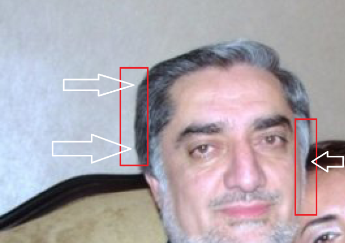 2) هر گاه اندازه تصویر مظنون را به کمک نرم افزار "فوتوشاپ" بزرگتر کنیم، می توانیم بخوبی "ساختگی بودن" آن را ببینیم. به تصویر زیر تماشا کنید، گرچه حاجت به شرح ندارد، اما می خواهم بگویم که "بریده شدن" عکس را، بخصوص در قسمت موه های داکتر عبدالله که در صورت طبیعی هیچ گاه بصورت مستقیم نمی باشد، می توان دریافت.
