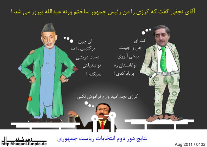 در حالیکه کلاه و چپن کرزی هردو بیشتر از ششصد افغانی ارزش ندارند و از مدت ده سال بدینسو بیچاره کرزی آنها را پینه و پتره کرده می پوشد ، حالا اگر با مبلغ نه ملیون افغانی مصرف یکسال دریشی داکتر عبدالله برای کرزی کلاه و چپن خریداری کنیم تمام کوه ها و دشت های افغانستان از کلاه و چپن پر خواهد شد حالا با در نظر داشت این واقعیت و مقایسه نفع و ضرر اقتصادی هردو گزینه به بودجه دولت اگر کسی مرا بخاطر تقلب که انگیزه آن فقط احساس مسؤلیت ملی و صرفه جویی در خزانه دولت بود ملامت میکند بفرماید من حرفی ندارم !