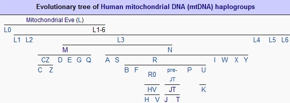 در علم ژنتيک انسانی برای بررسی شاخه مادری، تک گروه دی ان ای "ام تی" که بنام علمی" “ Human mitochondrial DNA haplogroup معروف است مورد آزمایش قرار می گیرد. دانشمندان "حوای میتوکندریایی" یا Mitochondrial Eve را به عنوان یگانه مادر مشترک تمام انسان ها معرفی می کنند. دانشمندان حدس می زنند که حوای میتوکندریایی ممکن است 200 هزار سال قبل در شرق آفریقا می زیسته است. دانشمندان زیر شاخه های مختلف این گروه دی ان ای را از 75 هزار سال قبل در شمال آفریقای امروز بدست آورده اند.