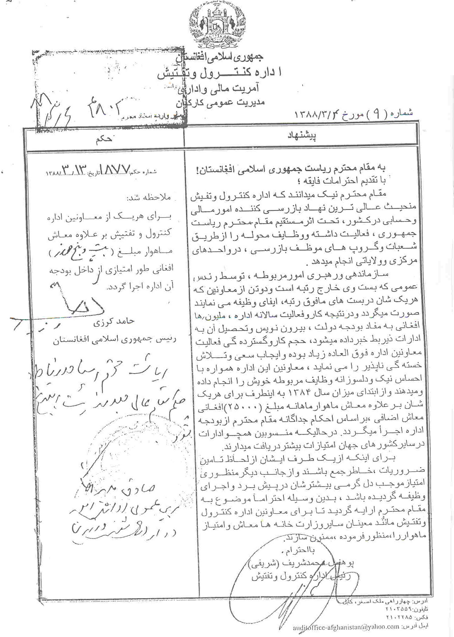 دیده میشود که مبلغ یک هزار دالر برای شریفی و مبلغ 25000 – افغانی برای معاونین در هر ماه بعد از صدور حکم شماره 1861 مورخ 10 / 3 /1390 رئیس جمهور غیر قانونی است یعنی یک مدد معاش باید برای انها تادیه گردد . یا با صدور حکم شماره 1861 حکم قبلی ویا مدد معاش قبلی لغو شده و قابل اجرا نمی باشد. کنترولر ها یک پیشنهاد را به مقام ریاست خزاین وزارت محترم مالیه نوشته تا به قناعت مقامات اداره کنترول و تفتیش غرض عدم مطالبه معاش متذکره پرداخته شود, محترم محمد آقا رئیس خزاین وزارت مالیه در حشوه پیشنهاد پول های غیر قانونی یعنی یک هزار دالرشریفی و 25000 – افغانی معاونین را رد کرده و قابل اجرا نه دانسته است