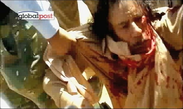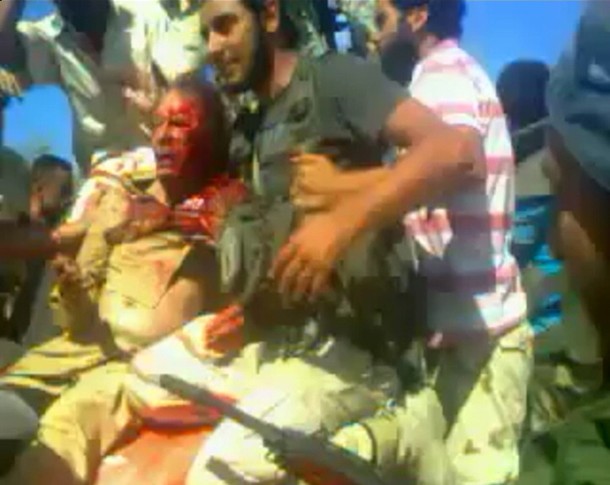 اکتبر 2011: چهار عکس از معمر قذافی که توسط مخالفانش ابتدا بازداشت و سپس کشته شد.
