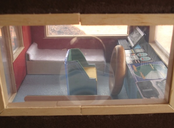 His other exhibit, My dream house is a combination of a traditional home in Afghanistan and an Australian home complete with swimming pool, car,garage, towels on the clothes line, neat grass and people inside. Made from balsa wood, dishcloths, felt, icy pole and matchsticks and plastic, all recycled here to astonishing effect. Trees made from earbuds. Rooftop picnic tables with Afghan carpets . Like the Dream Boat many hours of precise positioning of small objects and a complex level of juxtaposition certainly won over the hearts of many small children at the event who could relate to the narrative at work in the model. Home ownership may be still part of the Australian dream for some, and that certainly includes Hazara asylum seekers who risk their lives in boats to come here in the hope of one day bringing their wives and children to settle in a safe country where the opportunity of literacy and a life without violence is golden. One can only imagine a real life scale model of a house for Mr Javadi and his family in the future as an Australian resident with incredible skills to offer our society.