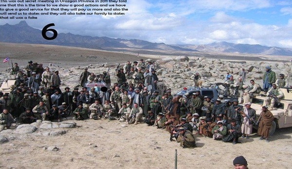 برای اثبات ادعای معاون رئیس جمهور،اینک لازم میدانم تا فوتوی یادگاری سربازان آمریکایی با طا لبان راکه تاکنون درهیچ یکی ازرسانه های جهان بنشرنرسیده است واز ولایت ارزگان افغانستان بدست آمده است ،آنرا بنشررسانیده وقضاوت خوانندگان گرامی را درخصوص این "جنگهای زرگری" وبازی به سرنوشت ملت بلاکشیدۀ افغان جلب نمایم: