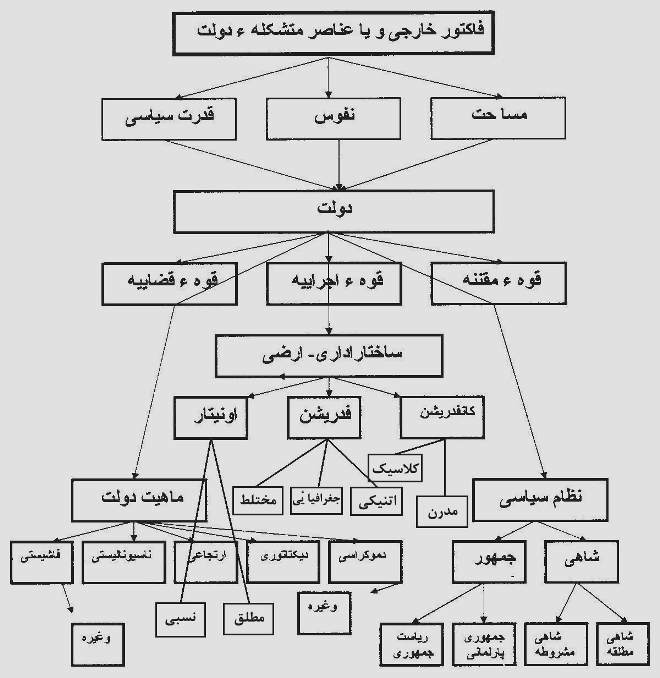 اجراييه و قوه قضاييه ميباشند. عوامل فوق الذکر يک اصل عمومی و قبول شده و بدون در نظر داشت ماهيت, خصوصيت، انواع و اقسام ساختار نظام سياسی، ساختار اداری – ارضی و تشکيلاتی ميباشد.